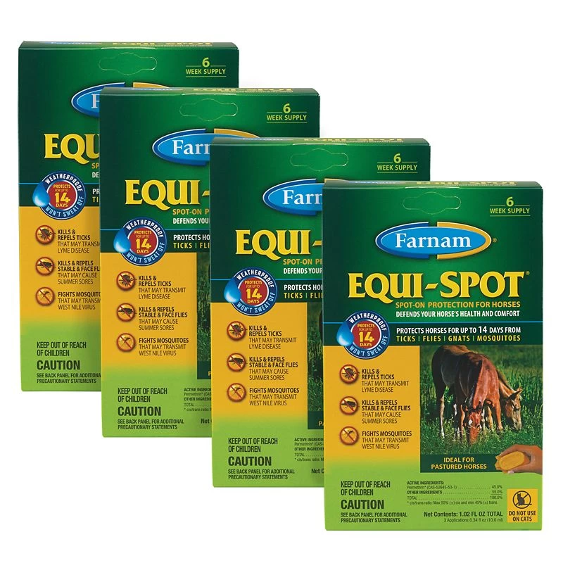 This 4-Pack provides a 24-week supply of Equi-Spot (four six-week supply packages). Use only on horses more than 12 weeks (three months) of age.