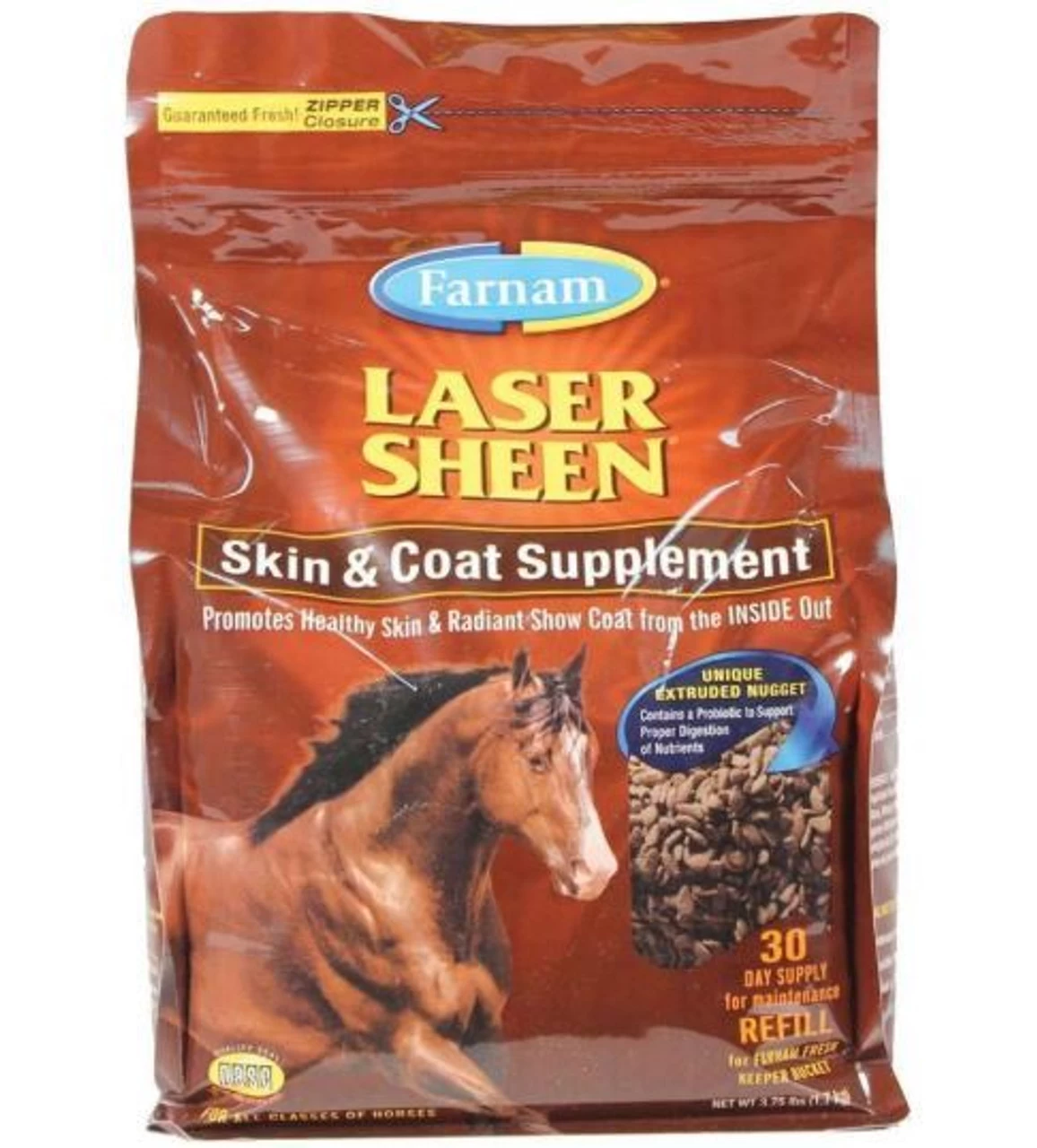 Farnam Laser Sheen Skin And Coat Supplement supports healthy mane and tail growth. Scientifically formulated for a proper balance of omega 3 and fatty acids.