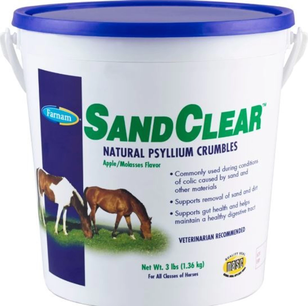 Farnam Sandclear Psyllium Fiber For Horses, 3Lbs softens stool and helps remove sand from the ventral colon. Highly palatable apple and molasses flavored crumbles.