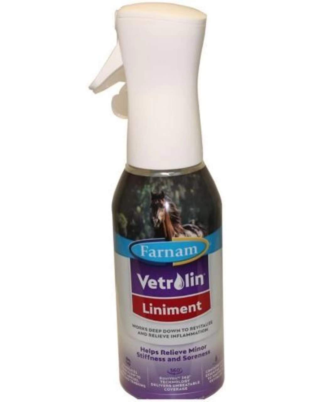 Farnam Vetrolin Liniment Equiveil Spray 360, 20 Oz works deep down to revitalize and speed recovery.