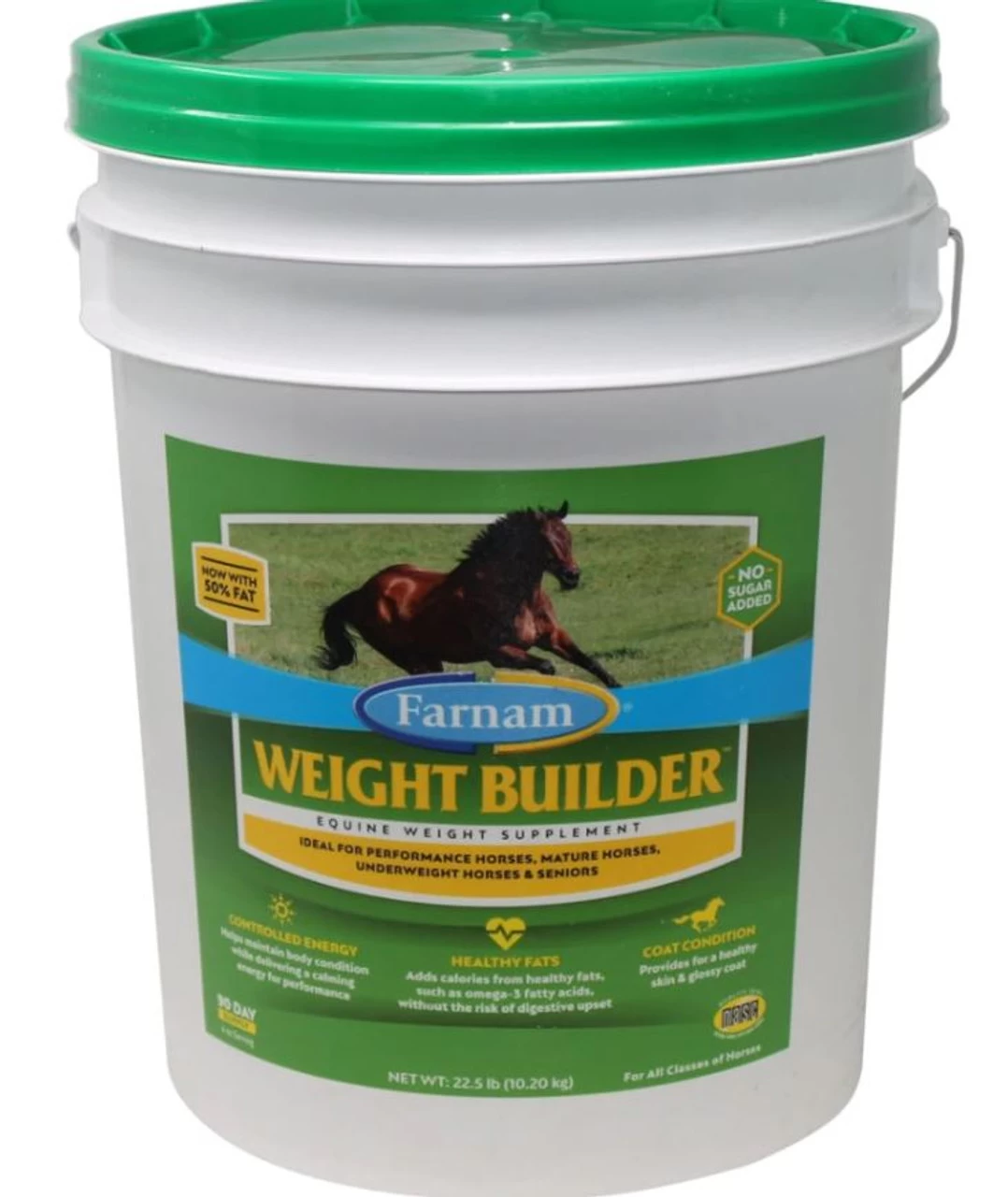 Farnam Weight Builder Equine Weight Supplement, 22.5 Lbs. is a high calorie supplement rich in Omega-3 fatty acids and contains twice the calories found in an equal amount of grain, but with none of the dangers. Helps support skin and coat conditioning while also providing fuel needed for top-level performance.