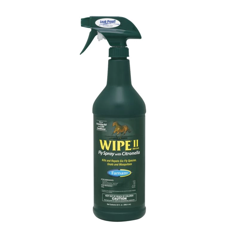 It is a violation of Federal law to use this product in a manner inconsistent with its labeling. WIPE® II Brand Fly Spray with Citronella has been especially developed for use on horses. It provides a protective hair coating against flies while imparting a high sheen to the hair when brushed out. 1-2 oz. per head per day gives adequate protection. Apply by either soft cloth or fine mist spray.